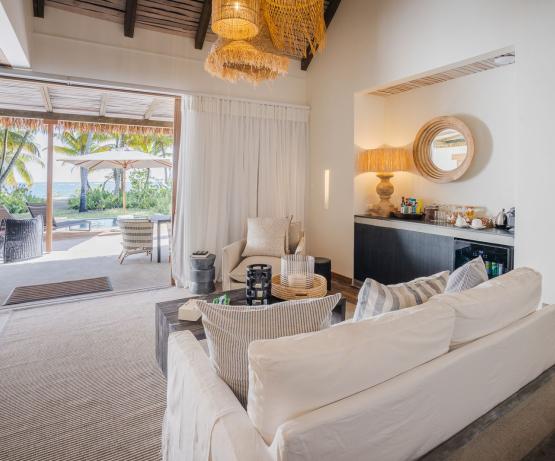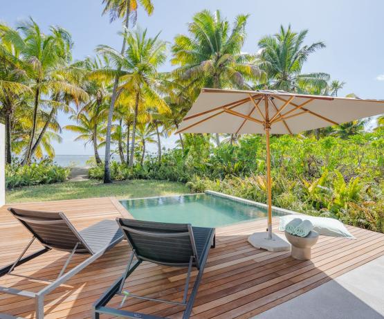 Beach Villa de 76 m2, villas individuelles situées dans le jardin, proches de la plage, avec salon, 2 salles de bains, terrasse et douche extérieure.