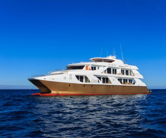 Le M/C Elite est un catamaran de luxe. Le bateau peut accueillir jusqu’à 16 passagers. Il offre 8 cabines « Golden Suite » (env. 35 m2, balcon inclus) et 1 cabine à usage individuel (env. 19 m2, balcon inclus). Toutes les cabines disposent d’un balcon privé, de fenêtres panoramiques, d’un petit canapé, d’un bureau, de salle de bain privée (avec douche et sèche-cheveux), de la climatisation. Salle à manger avec bar, grand salon, 2 petites terrasses avec chaises longues sur le pont supérieur, grand sundeck avec bar, jacuzzi et chaises longues. Des conférences sont proposées à bord. Un guide par maximum 10 passagers est prévu pour les visites. Le bateau M/C Elite est un des derniers-nés des Galápagos : il navigue depuis juin 2019. Les enfants sont acceptés à bord dès 7 ans.