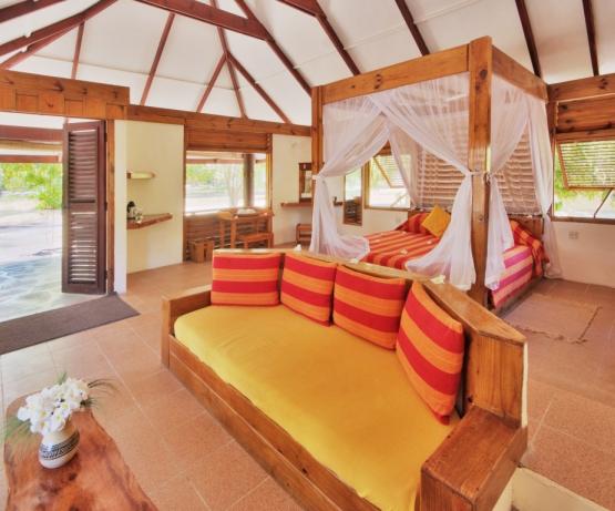 Bird Island dispose de 24 bungalows au confort simple mais confortable avec lit à baldaquin équipé de moustiquaire, coin salon et grande terrasse. Deux canapés convertibles permettent d'accueillir 2 personnes supplémentaires.