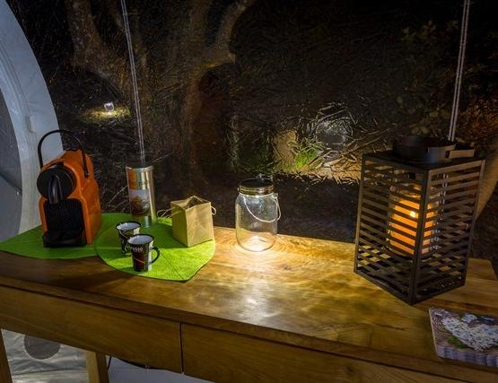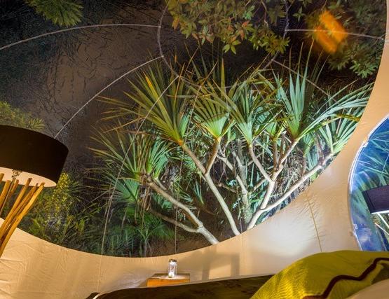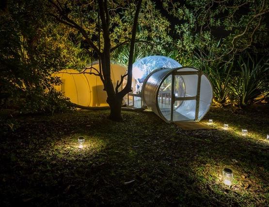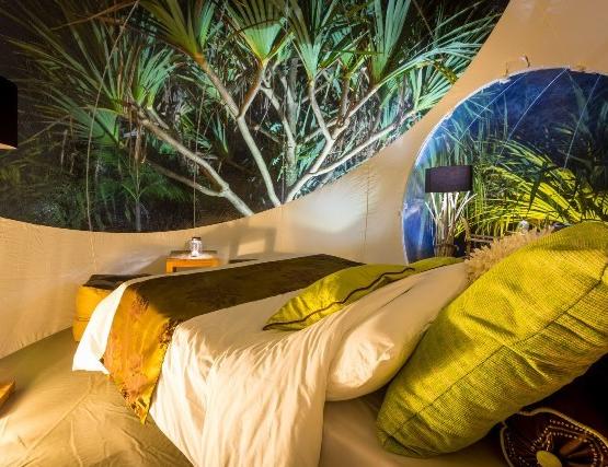 Double Bedroom Suite composée de 2 bulles connectées : une totalement transparente pour la chambre (avec un lit à baldaquin Queen size, meuble-console, théière et bouteille d'eau et lampes sur pieds, 2 poufs, une table basse), et une deuxième opaque pour la salle de bain. Celle-ci est équipée de toilettes sèches écologiques, d'un lavabo, un miroir, un meuble avec étagères, un tapis, des serviettes de bain, du savon, des bouchons d'oreilles et un masque de nuit. Le Bubble Lodge est installé sur une terrasse en bois qui dispose également d'une douche extérieure avec de l'eau chaude. La végétation environnante est éclairée par plusieurs projecteurs extérieurs, commandés par des interrupteurs à proximité du lit. L'air est climatisé et déshumidifié.
