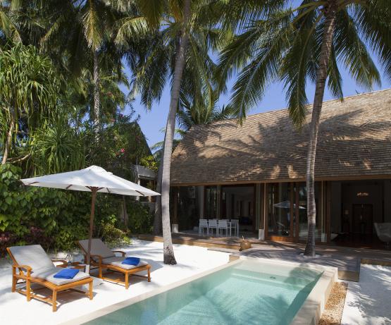 Beach Villas de 150 m2 située en front de mer avec grande salle de bains à ciel ouvert, terrasse et jardins privés. Accès direct à la plage.