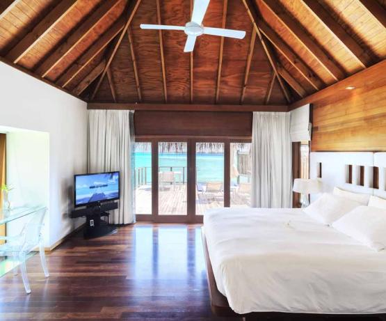 Deluxe Water Villa de 115 m2, spacieux pilotis situé sur le lagon, lit avec vue sur l’océan, bain à remous sur la terrasse face au coucher de soleil. Accès direct au lagon.