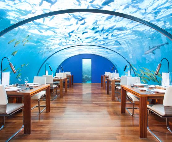 Conrad Rangali Maldives propose 9 ambiances culinaires. Vous dînerez par exemple dans l’unique restaurant vitré sous la mer « Ithaa Undersea Restaurant », en compagnie de la faune sous-marine.