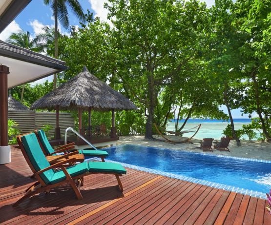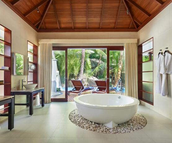 Deluxe Beachfront Pool Villas de 185 m2 situées en bord de plage, avec piscine en cascade de 6mx3, 2 chambres, salon, salle de bains avec double baignoire et double douche à l’italienne, vue sur le jardin privé, douche extérieure.