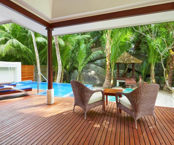 Deluxe Hillside Pool Villas de 185 m2 situées dans la végétation, avec piscine en cascade de 6mx3, 2 chambres, salon, salle de bains avec double baignoire et double douche à l’italienne, vue sur le jardin privé, douche extérieure.