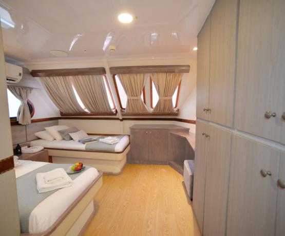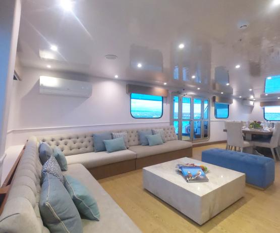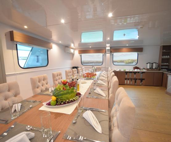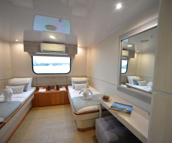 Le M/C Seaman Journey est un bateau de type catamaran à moteur de classe « touriste supérieur ». Le bateau peut accueillir jusqu’à 16 passagers. Il offre 6 cabines doubles à 2 lits non superposés sur le pont principal (env. 14 m2) et 2 cabines doubles avec lit matrimonial sur le pont supérieur (env. 18 m2). Chaque cabine dispose d’une grande fenêtre, de l’air conditionné, d’un coffre-fort et d’une salle de bain privée avec douche et sèche-cheveux. Grande pièce combinant salle à manger et salle de séjour avec bar, terrasse couverte sur le pont supérieur et sundeck avec chaises longues sur le dernier pont. Le bateau a été complètement redécoré en 2019.