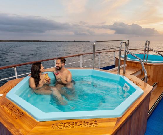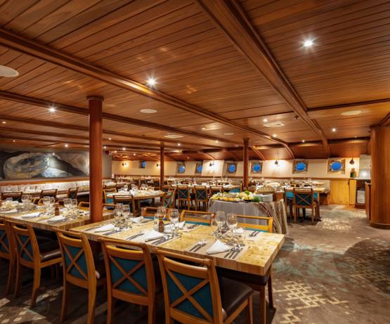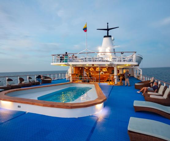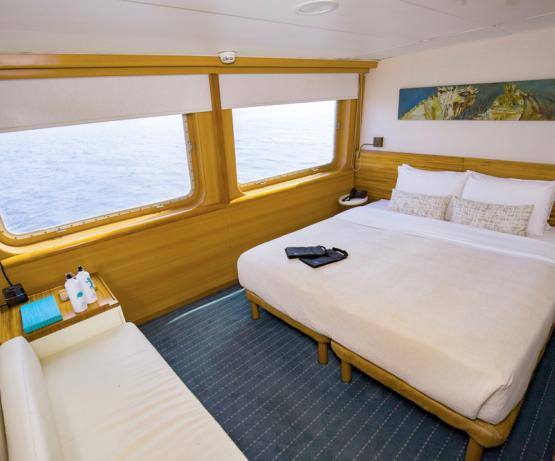 Toutes les cabines disposent de la climatisation, d’un coffre-fort et de salle de bain privée avec douche et sèche-cheveux. Salle à manger, auditorium, salle pour équipement de snorkeling, infirmerie (médecin à bord), salle de jeux pour enfants, bibliothèque, boutique, fitness, spa, 2 jacuzzis, salon-bar, terrasse avec piscine et chaises longues, restaurant extérieur. Le bateau dispose d’un petit zodiac à fond vitré qui vous permettra d’explorer les fonds marins sans avoir à vous mettre à l’eau. Des conférences sur les îles sont proposées par les guides. Les enfants de tout âge sont acceptés à bord.