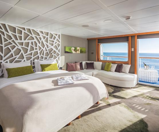 10 cabines « Balcony Suites » (env. 22 m2) avec larges fenêtres et balcon,