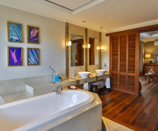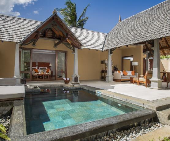 Presidential Suites Pool Villa. Villas de 345m2, une des plus prestigieuses de Maurice, nichées dans la végétation avec vue sur l’océan. Chaque villa est composée de 2 chambres avec salles de bains attenantes, un salon spacieux et un grand espace de plein air dont une piscine à débordement de 56m2. Service d’un majordome 24h/24.