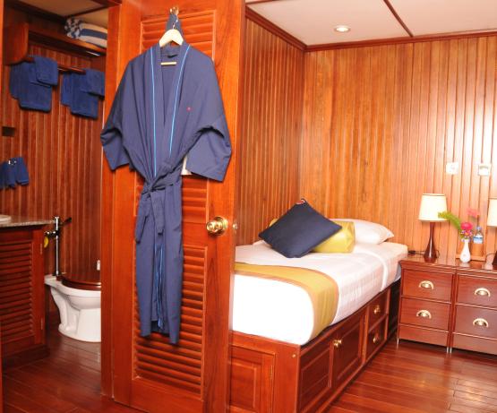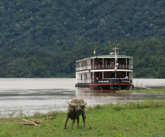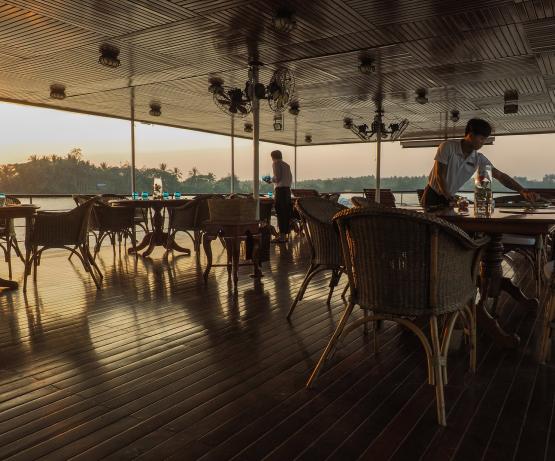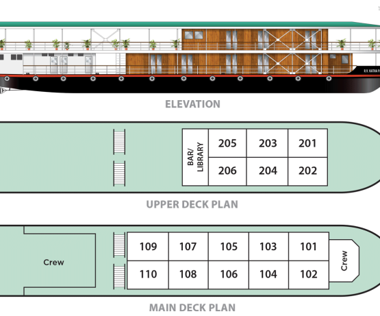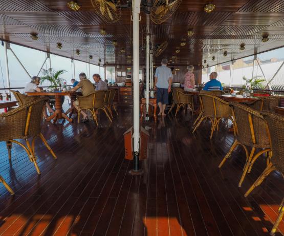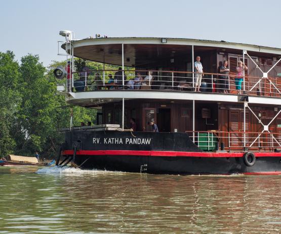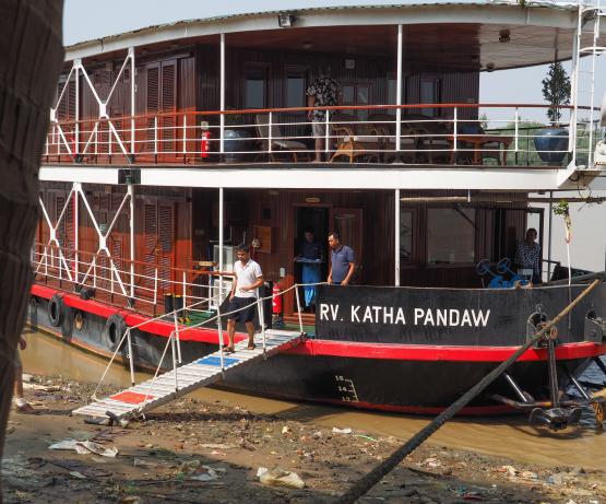 Il s'agit d'une conception radicalement nouvelle, basée sur l'ancienne classe K utilisée en Birmanie à partir des années 1880. Ce navire est le troisième Katha à naviguer sur l'Irrawaddy. Le premier a été construit à Dalla en 1887 mais a été perdu sur le Chindwin en 1889. Le deuxième a été construit par Denny of Dumbarton en 1904 et mis hors service en 1937 et le troisième a été construit par nous au Vietnam en 2012. Nous l'avons fait naviguer pendant un an sur le Mékong avant de l'envoyer en Birmanie. Avec seulement deux ponts, ces petits navires de la classe K ont un tirant d'air plus faible, ce qui leur permet de passer sous les ponts et de prétendre à un tirant d'eau plus faible, bien qu'en fait les chantiers navals vietnamiens n'y soient pas parvenus aussi bien que les chantiers birmans et que les navires de la classe K construits ultérieurement en Birmanie aient obtenu des réductions remarquables de leur tirant d'eau. L'aménagement général du Katha est singulier en ce sens qu'il supprime la salle à manger intérieure formelle. Cela a suscité de vives protestations de la part des passagers réguliers et de notre personnel. Finalement, tout le monde s'accorde à dire qu'il est bien plus agréable de manger à l'extérieur que dans une salle à manger fermée, étouffante et bruyante, et que les insectes ne sont pas si terribles que cela. Réaménagé pour les expéditions en Inde à partir de septembre 2019, nous avons réduit le nombre de cabines de seize à douze pour créer un salon/salle à manger intérieur plus grand, car les croisières hivernales en Inde peuvent être fraîches dès les premières heures.