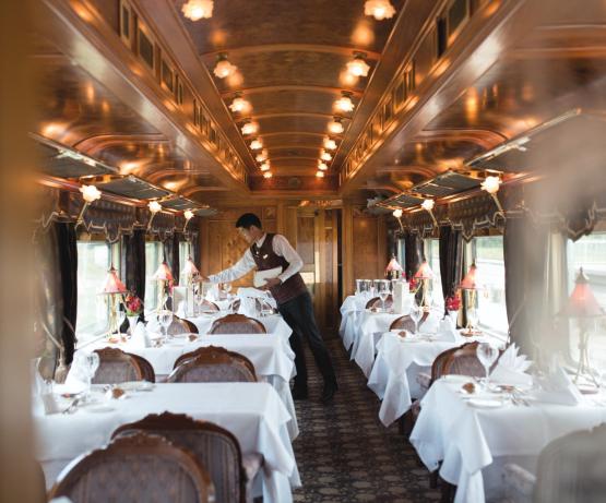 L'intérieur du train élégamment restauré est orné de superbes marqueteries et de boiseries en teck.