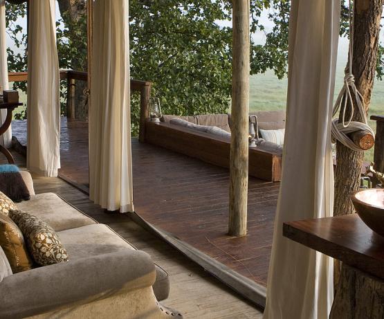 Le camp: 6 grandes tentes de brousse luxueuses, montées sur pilotis, avec une vue pittoresque sur les plaines avoisinantes. Toutes disposent d'une salle de bains privée, équipée de douche intérieure et extérieure. La salle de restaurant est également construite sur un ponton pour permettre d'admirer les paysages incroyables et les activités des animaux.