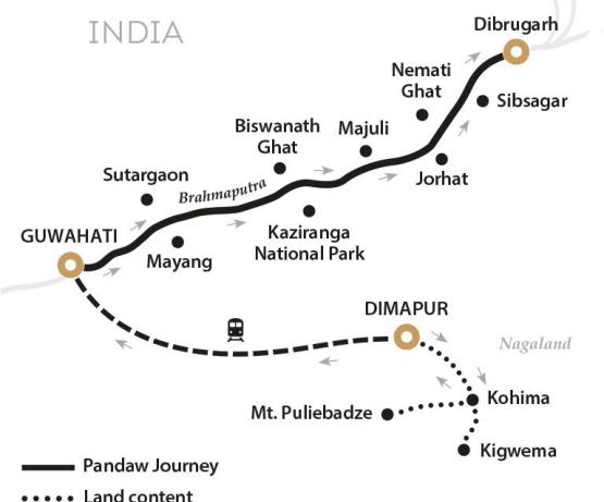 Après le petit-déjeuner, vous vous rendrez à la gare de Dimapur pour prendre le train à destination de Guwahati. Aucun voyage en Inde n'est complet sans l'expérience de l'un des réseaux ferroviaires les plus étendus au monde et ce voyage en train local offre des vues inégalées de cette région montagneuse. Le groupe voyagera ensemble dans un train local avec un panier-repas. À l'arrivée à Guwahati, transfert à l'hôtel pour la nuit et soirée libre. Nuit à l'hôtel Taj Vivanta ou similaire.