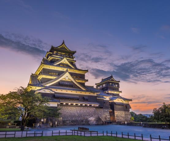 Trajet en train pour Kumamoto, qui fut une ville seigneuriale très prospère depuis le début 17ème siècle jusqu’à la révolution de Meiji en 1868. La rivière Shirakawa et ses affluents la traversent, ce qui lui vaut le surnom de "la ville des bois et de l'eau fraîche" pour ses cours d'eau et ses nombreux jardins. Elle est notamment connue pour son magnifique château.