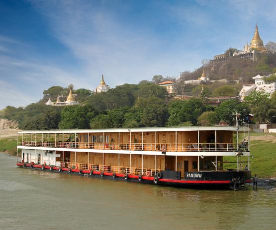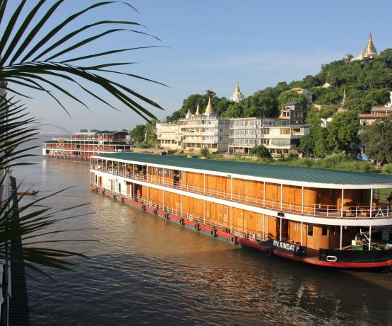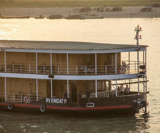 Le Kindat original a été construit en 1886 par Yarrows à Londres et a coulé en 1920. Elle a été nommée d'après une petite ville de Chindwin. Construit en 2014, c'est un navire à tirant d'eau très peu profond qui peut naviguer à peu près n'importe où à tout moment, assez grand pour transporter 30-40 passagers avec beaucoup d'espace de pont extérieur. Il dispose d'un espace flexible offrant aux passagers des repas intérieurs ou extérieurs en fonction de l'envie et des conditions météorologiques. Le navire dispose de VTT de qualité pour votre exploration indépendante.
