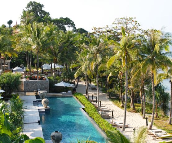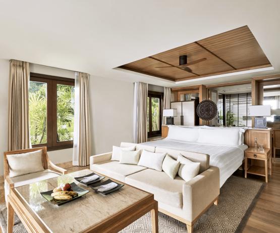 Les hébergements les plus demandés - les Ocean Front Pool Villas - se situent à environ 8 m au-dessus de la plage et de la baie. Cette catégorie de villas offre une vue panoramique imprenable sur la mer. Ces villas offrent une surface totale de 240 mètres carrés, y compris une chambre à coucher climatisée de 96 mètres carrés et une salle de bain lumineuse donnant sur le jardin, une piscine privée à débordement de 10 mètres de long faisant face à la mer, des salles à manger et des terrasses en teck et une douche extérieure privée. Toutes les villas avec piscine offrent une intimité incomparable et se trouvent à une courte distance de marche des principales installations de l'hôtel.