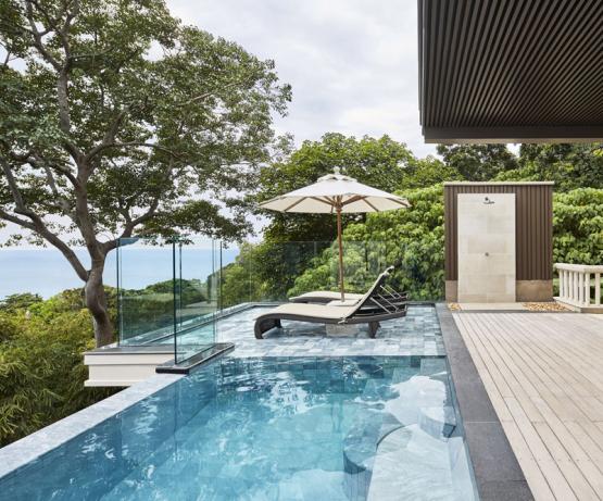Les Signature Ocean View Pool Suites de 230 mètres carrés se trouvent au niveau le plus élevé du Trisara et offrent aux hôtes une vue magnifique sur la jungle bien entretenue et la mer. L'intérieur est moderne et les suites sont équipées d'un lit king-size surdimensionné dans la chambre à coucher avec salle de bain privée, qui s'ouvre sur le salon par une porte coulissante. Le salon dispose de son propre coin repas et de canapés qui se transforment en lit double, ainsi que d'une douche extérieure. Sur la vaste terrasse se trouve une piscine à débordement de 9 mètres de long avec une vue panoramique sur l'océan et une magnifique brise tropicale.