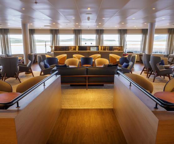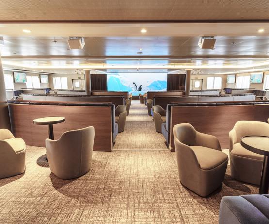Les espaces communs au design élégant et moderne vous offriront une expérience de qualité : salon-bar panoramique, restaurant principal, bistro, auditorium, sauna avec fenêtres panoramique, spa, fitness. Toutes les visites et conférences sont faites par des guides-naturalistes parlant anglais. Certaines dates de départ garantissent la présence d’un guide francophone.